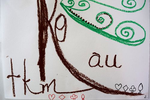 See the I? the I is quite big and bold because that’s me – “I Am,” and it’s this heart again arohanui (Molly points to her moko), arohanui comes from the heart, soul, mauritau is the holding you together, manawanui is being courageous, the big heart… and I’m saying, yes, it’s time to go home and have a rest and I’m at the end going Ae, home time,” In a later conversation Molly described how for her nature and art are one, “My whole childhood was based on art; I was surround by art. We grew up in the bush with artwork in the leaves, in the shapes and colours of different leaves. Also, in the meeting houses on the marae with tukutuku and carvings from my ancestors.”
